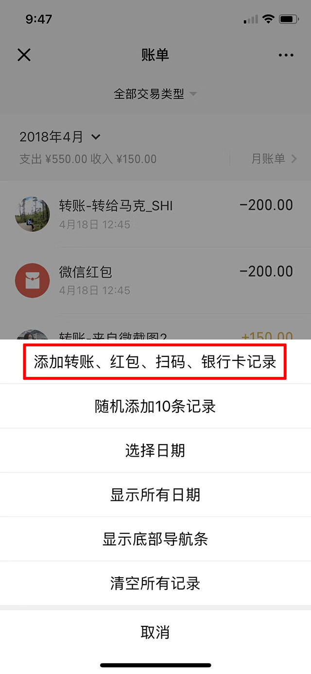 2.点击选择添加转账、红包、扫码、银行卡记录(或可以选择随机添加记录)