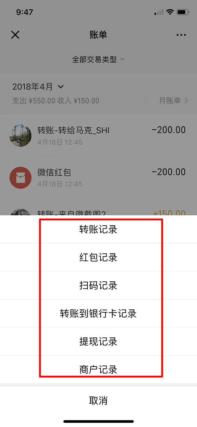 3.然后选择你要添加的记录类型,包括转微信账记录、红包记录、扫码记录、转账到银行卡记录、提现记录、商户记录等